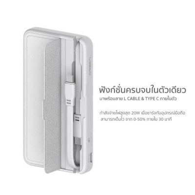 Eloop Orsen EW55 20,000 mAh Magnetic Wireless Charger supports PD 20W. Features 10,000 mAh backup battery The latest design is made of PU leather and ABS plastic, making it look more premium. Magnetic Cover Easy-to-use cable storage cover With magnetic system Built-in charging cable with 2 ports, Type C and L Cable. Supports PD and QC 3.0 charging technology up to 20W, meeting all devices that support fast charging in this modern era. Can shake to check the remaining battery status. Input Type-C 20W charges the power bank faster. There is an LED light indicating the working status and capacity of the power bank. There is a green light indicating the Quick Charge/Fast Charge status. Safety system Automatically cut off the power when fully charged. Prevents power surges. Certified by international standards CE, FCC, RoHS, TIS. Technical Data Model: E57 Input (Type-C): 5V/2.4A 9V/2.22A 12V/1.67A Output (Type-C): 5V/3A 9V/2.22A 12V/1.67A Type-C Cable (Output): 5V/3A 9V/2A 12V/1.5A L Cable (Output): 5V/2.4A 9V/2.22A Total Output: 20W (Max) Battery Type: Li-Polymer Charging time: About 3 hours What's in the box Eloop Orsen E57 10,000 mAh power bank User manual Eloop power bank case The product has a scratch code to check the authenticity. The product is distributed by an authorized importer. 100% authentic .