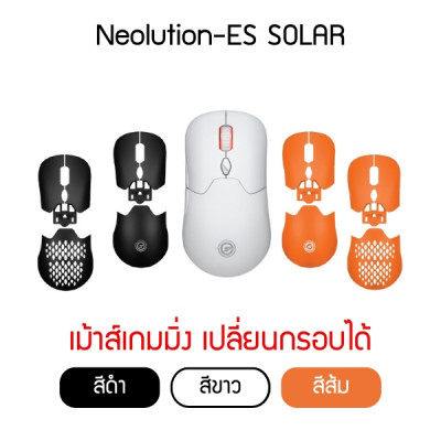 (ITGG104) เมาส์เกมมิ่งไร้สาย Neolution E-Sport SOLAR - P1020เมาส์เกมมิ่งไร้สาย Neolution E-Sport SOLAR เชื่อมต่อบลูทูธได้ ใช้ได้ทั้งเสียบสาย ไร้สาย และบลูทูธ (3 ระบบ) สามารถปลี่ยนกรอบได้ถึง 3 สี ดำ ส้มและขาว มีสวิซต์ให้เปลี่ยนถึง 3 คู่ สามารถเปลี่ยนกรอบเมาส์ได้ตามใจชอบ มีโหมดไฟถึง 10 โหมด