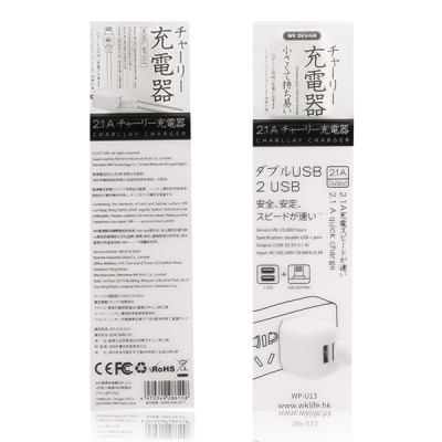 WK Charllay Charger + Micro Charging Cable Features: Very light weight, compact, easy to carry. 2 USB ports that provide 2.1A current, can charge 2 smartphones simultaneously. Free to choose iPhone or Micro USB charging cable. Technical Data Input: AC100-240V 50/60Hz 0.3A Output: DC5V-2.1A What's in the box WK 2.1A Charllay Charger WP-U13 Free charging cable (choose iPhone or Micro USB) 1-year full warranty package .